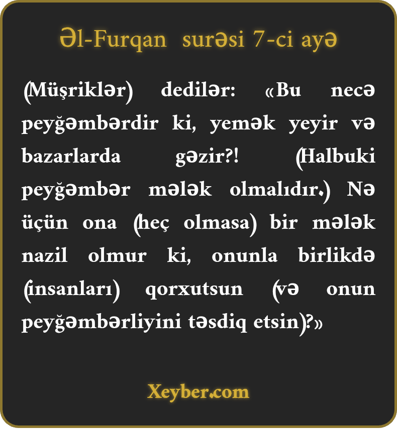 (Müşriklər) dedilər: «Bu necə peyğəmbərdir ki, yemək yeyir və bazarlarda gəzir?! (Halbuki peyğəmbər mələk olmalıdır.) Nə üçün ona (heç olmasa) bir mələk nazil olmur ki, onunla birlikdə (insanları) qorxutsun (və onun peyğəmbərliyini təsdiq etsin)?»