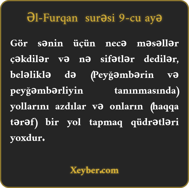 Gör sənin üçün necə məsəllər çəkdilər və nə sifətlər dedilər, beləliklə də (Peyğəmbərin və peyğəmbərliyin tanınmasında) yollarını azdılar və onların (haqqa tərəf) bir yol tapmaq qüdrətləri yoxdur.
