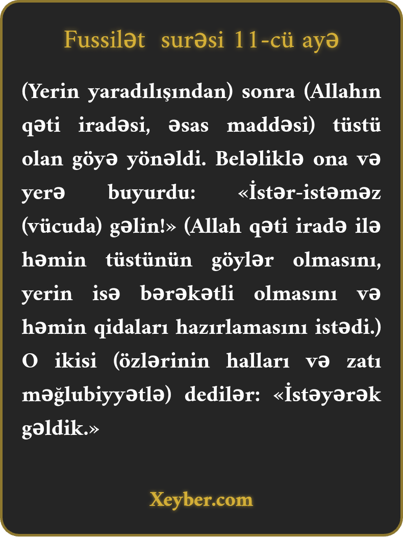 (Yerin yaradılışından) sonra (Allahın qəti iradəsi, əsas maddəsi) tüstü olan göyə yönəldi. Beləliklə ona və yerə buyurdu: «İstər-istəməz (vücuda) gəlin!» (Allah qəti iradə ilə həmin tüstünün göylər olmasını, yerin isə bərəkətli olmasını və həmin qidaları hazırlamasını istədi.) O ikisi (özlərinin halları və zatı məğlubiyyətlə) dedilər: «İstəyərək gəldik.»