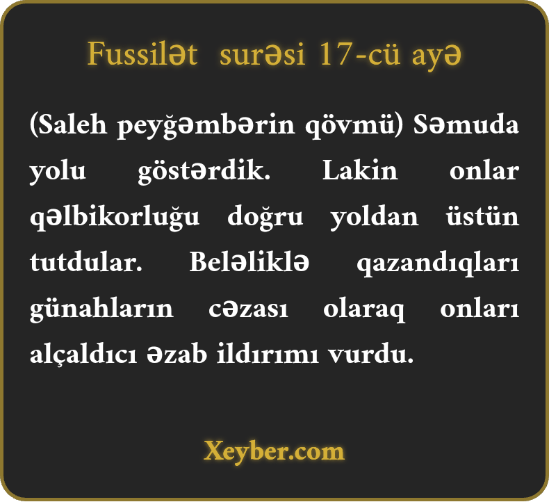 (Saleh peyğəmbərin qövmü) Səmuda yolu göstərdik. Lakin onlar qəlbikorluğu doğru yoldan üstün tutdular. Beləliklə qazandıqları günahların cəzası olaraq onları alçaldıcı əzab ildırımı vurdu.