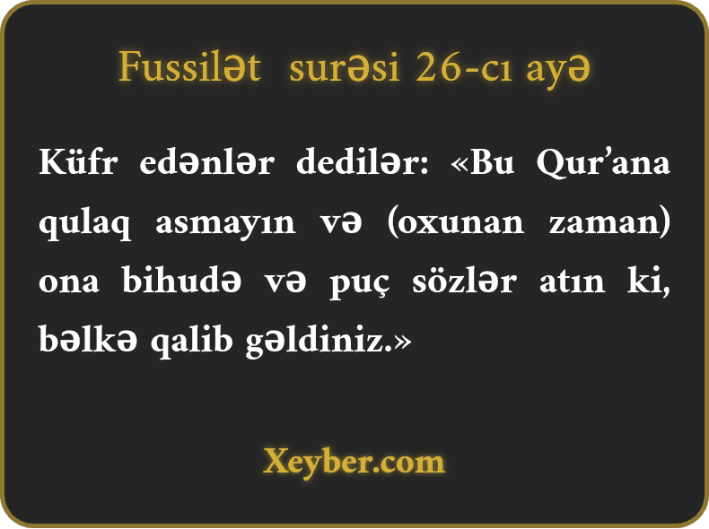 Küfr edənlər dedilər: «Bu Qur’ana qulaq asmayın və (oxunan zaman) ona bihudə və puç sözlər atın ki, bəlkə qalib gəldiniz.»