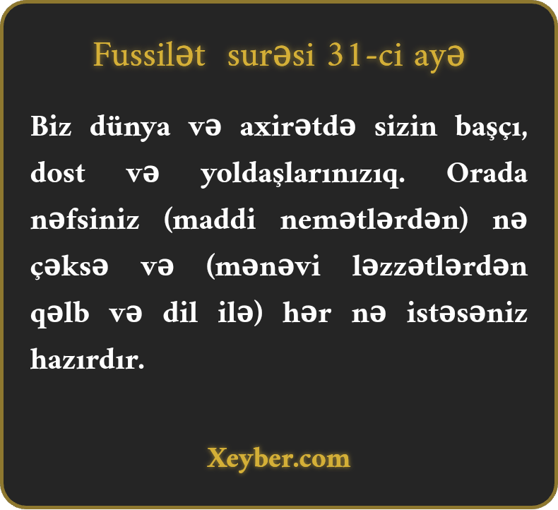 Biz dünya və axirətdə sizin başçı, dost və yoldaşlarınızıq. Orada nəfsiniz (maddi nemətlərdən) nə çəksə və (mənəvi ləzzətlərdən qəlb və dil ilə) hər nə istəsəniz hazırdır.