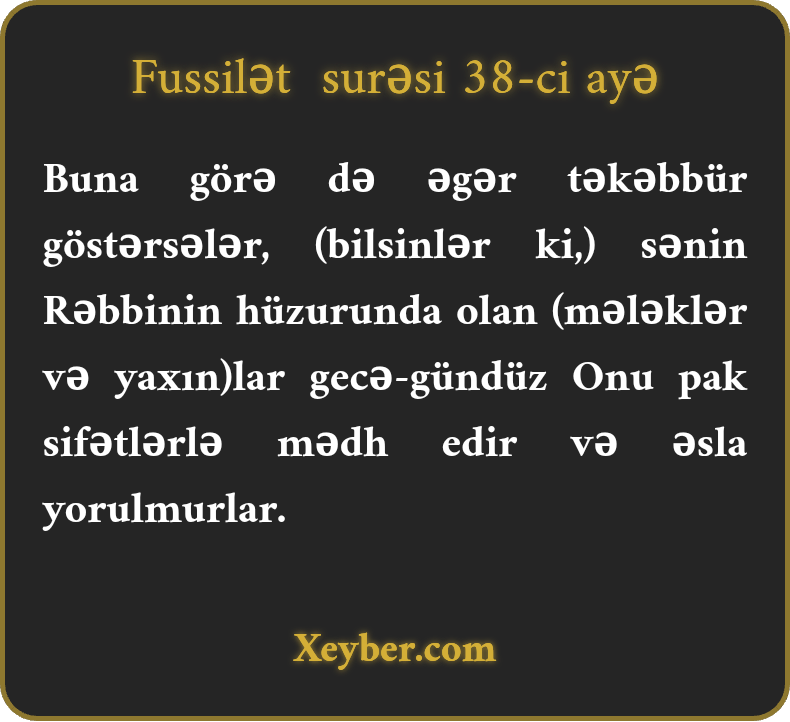 Buna görə də əgər təkəbbür göstərsələr, (bilsinlər ki,) sənin Rəbbinin hüzurunda olan (mələklər və yaxın)lar gecə-gündüz Onu pak sifətlərlə mədh edir və əsla yorulmurlar.