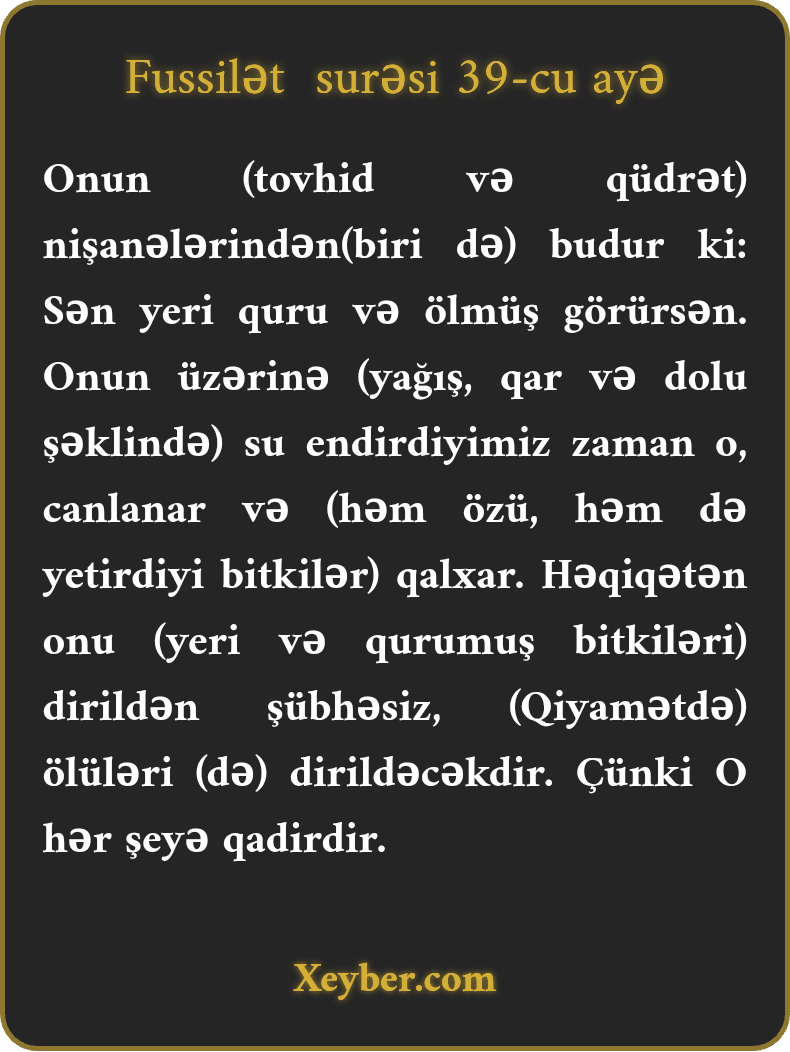 Onun (tovhid və qüdrət) nişanələrindən(biri də) budur ki: Sən yeri quru və ölmüş görürsən. Onun üzərinə (yağış, qar və dolu şəklində) su endirdiyimiz zaman o, canlanar və (həm özü, həm də yetirdiyi bitkilər) qalxar. Həqiqətən onu (yeri və qurumuş bitkiləri) dirildən şübhəsiz, (Qiyamətdə) ölüləri (də) dirildəcəkdir. Çünki O hər şeyə qadirdir.