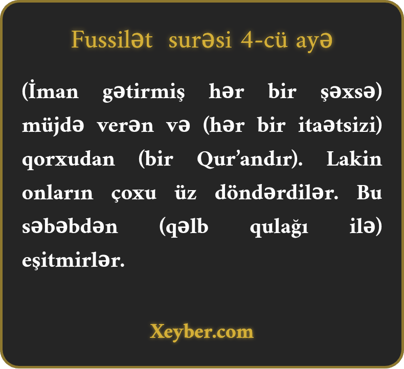 (İman gətirmiş hər bir şəxsə) müjdə verən və (hər bir itaətsizi) qorxudan (bir Qur’andır). Lakin onların çoxu üz döndərdilər. Bu səbəbdən (qəlb qulağı ilə) eşitmirlər.