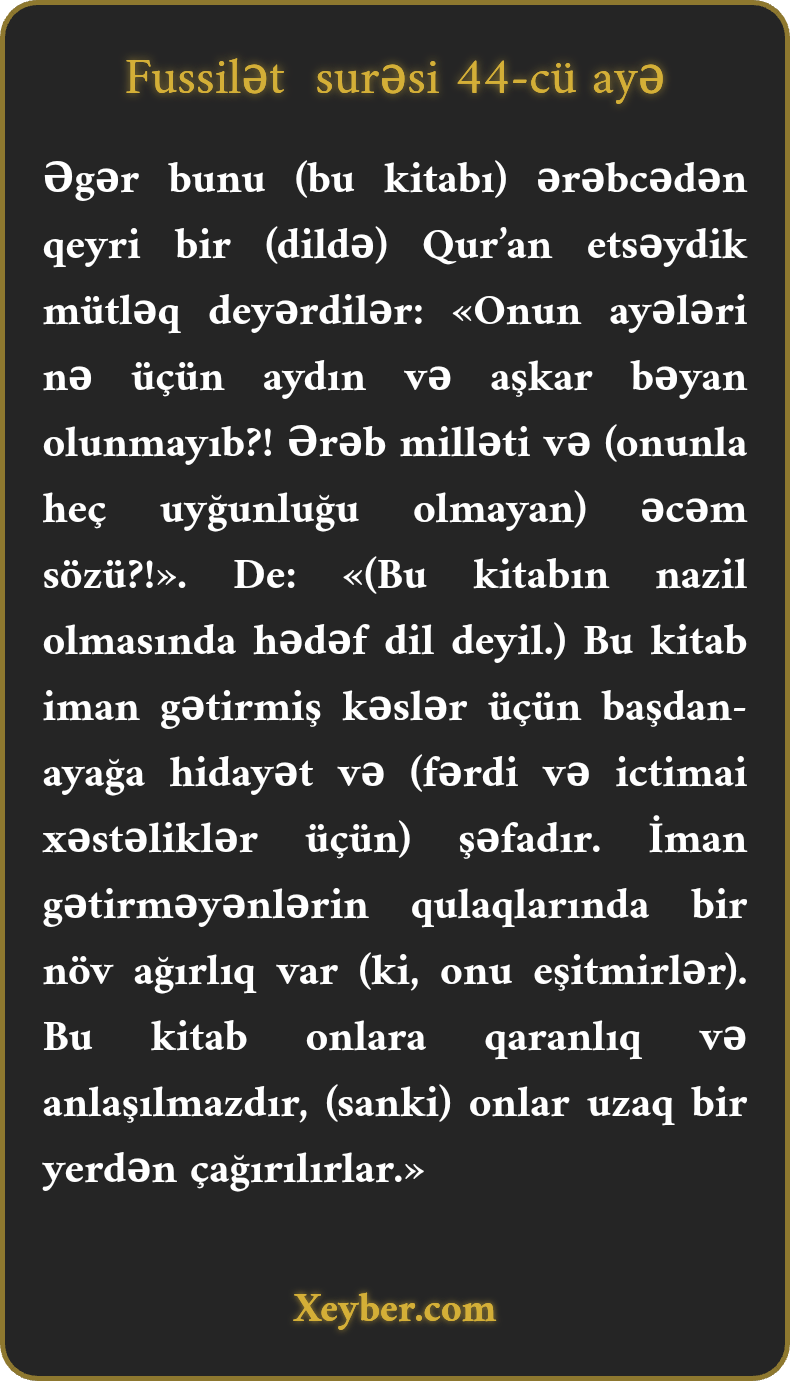 Əgər bunu (bu kitabı) ərəbcədən qeyri bir (dildə) Qur’an etsəydik mütləq deyərdilər: «Onun ayələri nə üçün aydın və aşkar bəyan olunmayıb?! Ərəb milləti və (onunla heç uyğunluğu olmayan) əcəm sözü?!». De: «(Bu kitabın nazil olmasında hədəf dil deyil.) Bu kitab iman gətirmiş kəslər üçün başdan-ayağa hidayət və (fərdi və ictimai xəstəliklər üçün) şəfadır. İman gətirməyənlərin qulaqlarında bir növ ağırlıq var (ki, onu eşitmirlər). Bu kitab onlara qaranlıq və anlaşılmazdır, (sanki) onlar uzaq bir yerdən çağırılırlar.»