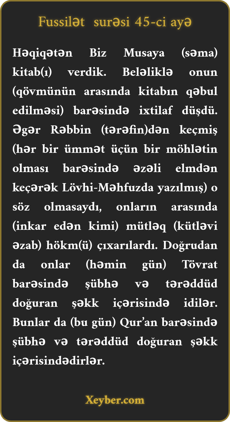 Həqiqətən Biz Musaya (səma) kitab(ı) verdik. Beləliklə onun (qövmünün arasında kitabın qəbul edilməsi) barəsində ixtilaf düşdü. Əgər Rəbbin (tərəfin)dən keçmiş (hər bir ümmət üçün bir möhlətin olması barəsində əzəli elmdən keçərək Lövhi-Məhfuzda yazılmış) o söz olmasaydı, onların arasında (inkar edən kimi) mütləq (kütləvi əzab) hökm(ü) çıxarılardı. Doğrudan da onlar (həmin gün) Tövrat barəsində şübhə və tərəddüd doğuran şəkk içərisində idilər. Bunlar da (bu gün) Qur’an barəsində şübhə və tərəddüd doğuran şəkk içərisindədirlər.