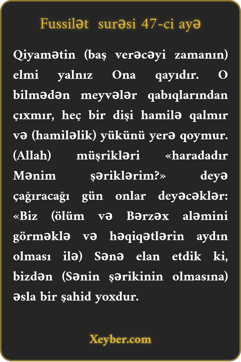 Qiyamətin (baş verəcəyi zamanın) elmi yalnız Ona qayıdır. O bilmədən meyvələr qabıqlarından çıxmır, heç bir dişi hamilə qalmır və (hamiləlik) yükünü yerə qoymur. (Allah) müşrikləri «haradadır Mənim şəriklərim?» deyə çağıracağı gün onlar deyəcəklər: «Biz (ölüm və Bərzəx aləmini görməklə və həqiqətlərin aydın olması ilə) Sənə elan etdik ki, bizdən (Sənin şərikinin olmasına) əsla bir şahid yoxdur.