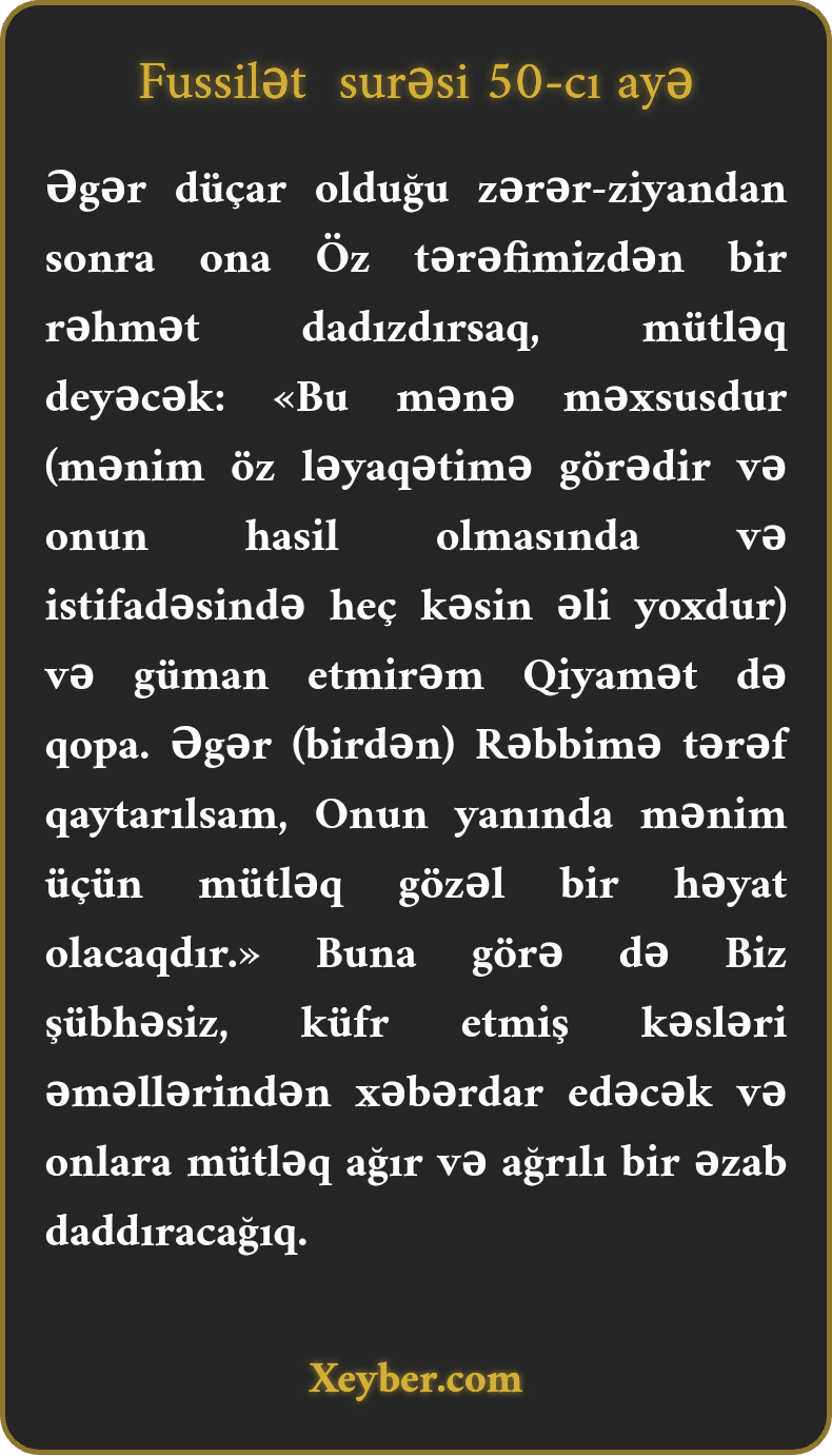 Əgər düçar olduğu zərər-ziyandan sonra ona Öz tərəfimizdən bir rəhmət dadızdırsaq, mütləq deyəcək: «Bu mənə məxsusdur (mənim öz ləyaqətimə görədir və onun hasil olmasında və istifadəsində heç kəsin əli yoxdur) və güman etmirəm Qiyamət də qopa. Əgər (birdən) Rəbbimə tərəf qaytarılsam, Onun yanında mənim üçün mütləq gözəl bir həyat olacaqdır.» Buna görə də Biz şübhəsiz, küfr etmiş kəsləri əməllərindən xəbərdar edəcək və onlara mütləq ağır və ağrılı bir əzab daddıracağıq.