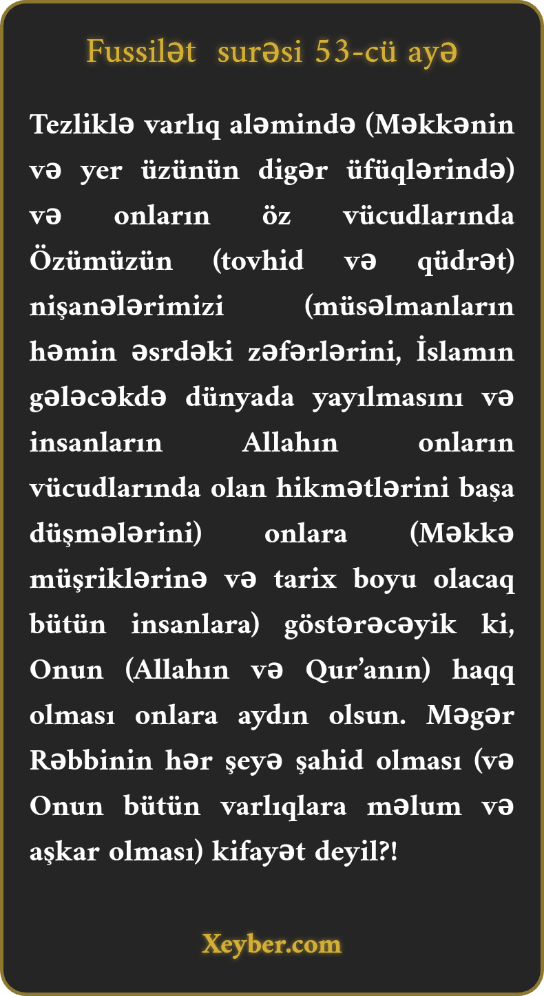 Tezliklə varlıq aləmində (Məkkənin və yer üzünün digər üfüqlərində) və onların öz vücudlarında Özümüzün (tovhid və qüdrət) nişanələrimizi (müsəlmanların həmin əsrdəki zəfərlərini, İslamın gələcəkdə dünyada yayılmasını və insanların Allahın onların vücudlarında olan hikmətlərini başa düşmələrini) onlara (Məkkə müşriklərinə və tarix boyu olacaq bütün insanlara) göstərəcəyik ki, Onun (Allahın və Qur’anın) haqq olması onlara aydın olsun. Məgər Rəbbinin hər şeyə şahid olması (və Onun bütün varlıqlara məlum və aşkar olması) kifayət deyil?!