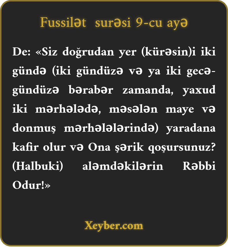 De: «Siz doğrudan yer (kürəsin)i iki gündə (iki gündüzə və ya iki gecə-gündüzə bərabər zamanda, yaxud iki mərhələdə, məsələn maye və donmuş mərhələlərində) yaradana kafir olur və Ona şərik qoşursunuz? (Halbuki) aləmdəkilərin Rəbbi Odur!»