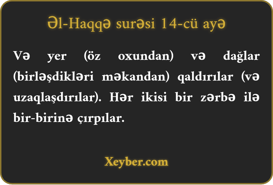 Və yer (öz oxundan) və dağlar (birləşdikləri məkandan) qaldırılar (və uzaqlaşdırılar). Hər ikisi bir zərbə ilə bir-birinə çırpılar.