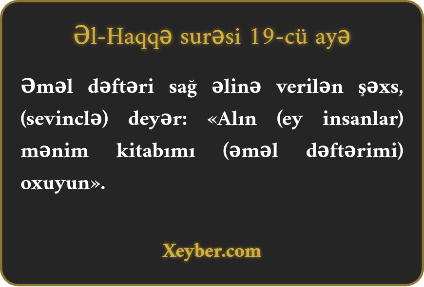 Əməl dəftəri sağ əlinə verilən şəxs, (sevinclə) deyər: «Alın (ey insanlar) mənim kitabımı (əməl dəftərimi) oxuyun».