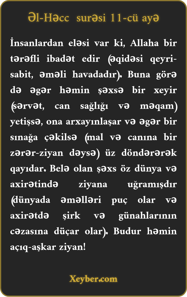İnsanlardan eləsi var ki, Allaha bir tərəfli ibadət edir (əqidəsi qeyri-sabit, əməli havadadır). Buna görə də əgər həmin şəxsə bir xeyir (sərvət, can sağlığı və məqam) yetişsə, ona arxayınlaşar və əgər bir sınağa çəkilsə (mal və canına bir zərər-ziyan dəysə) üz döndərərək qayıdar. Belə olan şəxs öz dünya və axirətində ziyana uğramışdır (dünyada əməlləri puç olar və axirətdə şirk və günahlarının cəzasına düçar olar). Budur həmin açıq-aşkar ziyan!
