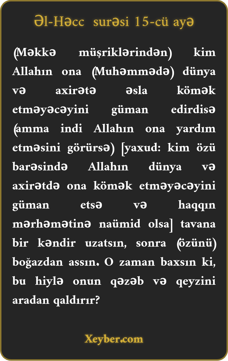 (Məkkə müşriklərindən) kim Allahın ona (Muhəmmədə) dünya və axirətə əsla kömək etməyəcəyini güman edirdisə (amma indi Allahın ona yardım etməsini görürsə) [yaxud: kim özü barəsində Allahın dünya və axirətdə ona kömək etməyəcəyini güman etsə və haqqın mərhəmətinə naümid olsa] tavana bir kəndir uzatsın, sonra (özünü) boğazdan assın. O zaman baxsın ki, bu hiylə onun qəzəb və qeyzini aradan qaldırır?