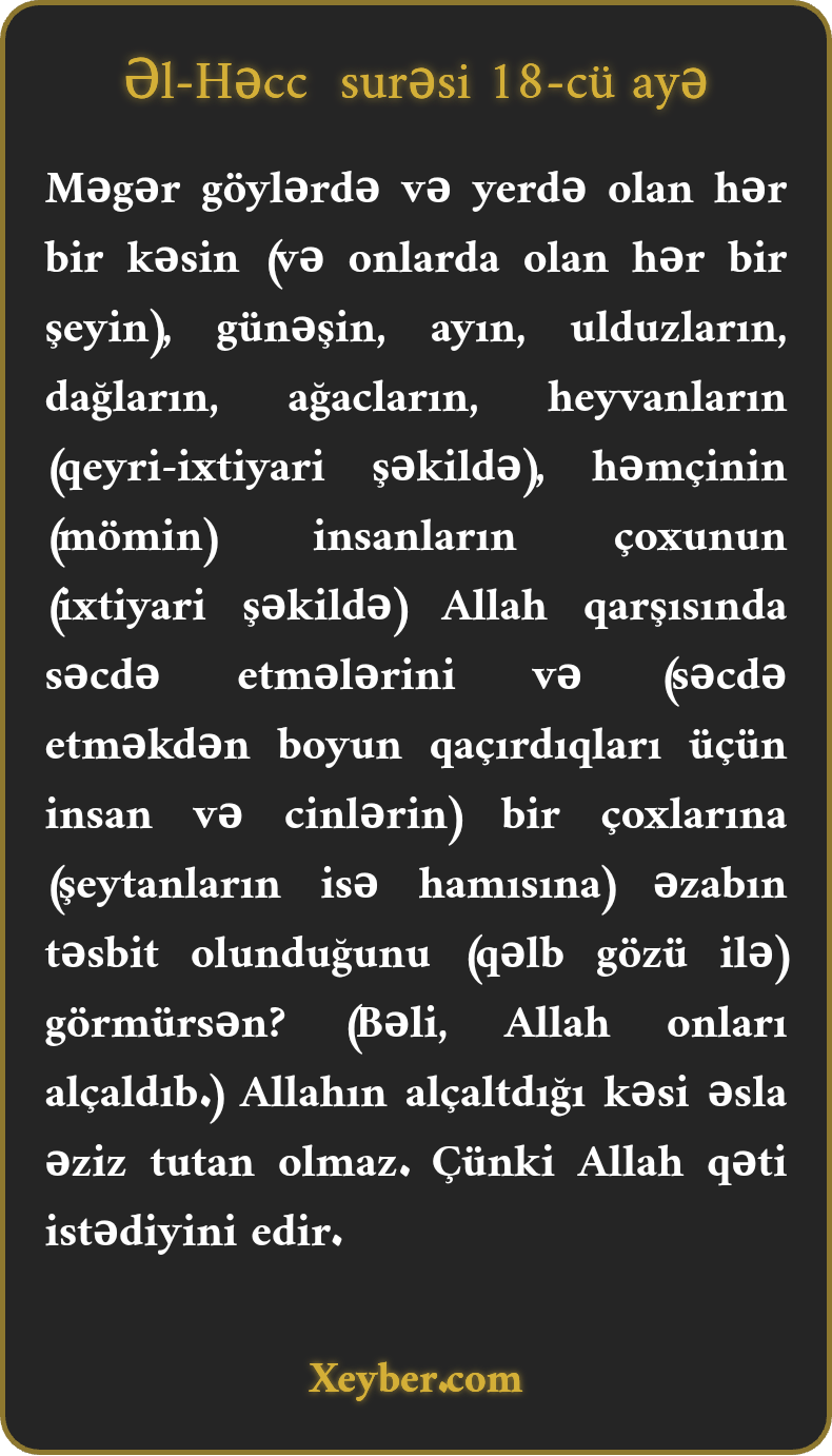 Məgər göylərdə və yerdə olan hər bir kəsin (və onlarda olan hər bir şeyin), günəşin, ayın, ulduzların, dağların, ağacların, heyvanların (qeyri-ixtiyari şəkildə), həmçinin (mömin) insanların çoxunun (ixtiyari şəkildə) Allah qarşısında səcdə etmələrini və (səcdə etməkdən boyun qaçırdıqları üçün insan və cinlərin) bir çoxlarına (şeytanların isə hamısına) əzabın təsbit olunduğunu (qəlb gözü ilə) görmürsən? (Bəli, Allah onları alçaldıb.) Allahın alçaltdığı kəsi əsla əziz tutan olmaz. Çünki Allah qəti istədiyini edir.