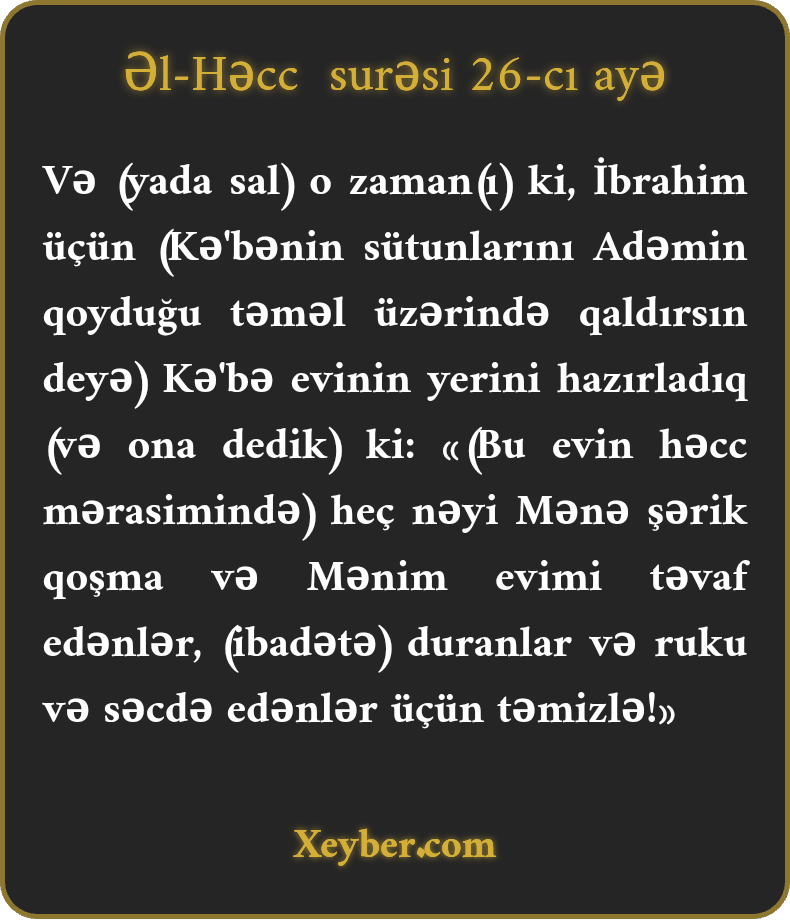 Və (yada sal) o zaman(ı) ki, İbrahim üçün (Kə'bənin sütunlarını Adəmin qoyduğu təməl üzərində qaldırsın deyə) Kə'bə evinin yerini hazırladıq (və ona dedik) ki: «(Bu evin həcc mərasimində) heç nəyi Mənə şərik qoşma və Mənim evimi təvaf edənlər, (ibadətə) duranlar və ruku və səcdə edənlər üçün təmizlə!»