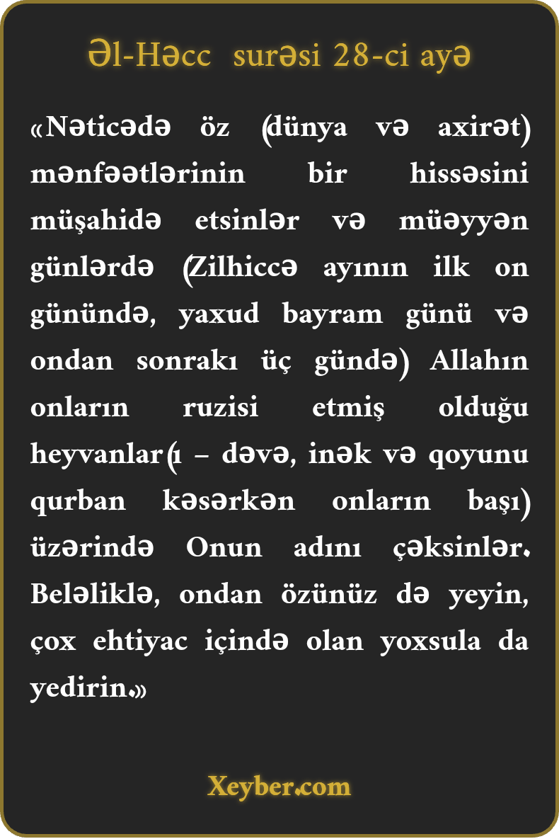 «Nəticədə öz (dünya və axirət) mənfəətlərinin bir hissəsini müşahidə etsinlər və müəyyən günlərdə (Zilhiccə ayının ilk on günündə, yaxud bayram günü və ondan sonrakı üç gündə) Allahın onların ruzisi etmiş olduğu heyvanlar(ı – dəvə, inək və qoyunu qurban kəsərkən onların başı) üzərində Onun adını çəksinlər. Beləliklə, ondan özünüz də yeyin, çox ehtiyac içində olan yoxsula da yedirin.»