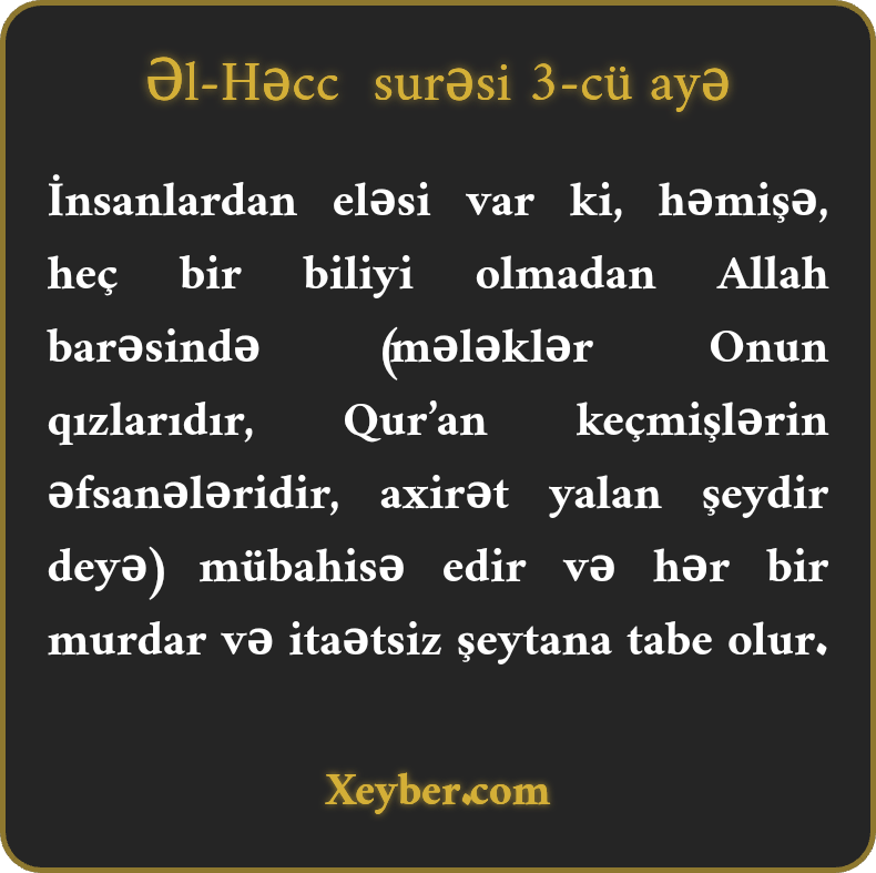 İnsanlardan eləsi var ki, həmişə, heç bir biliyi olmadan Allah barəsində (mələklər Onun qızlarıdır, Qur’an keçmişlərin əfsanələridir, axirət yalan şeydir deyə) mübahisə edir və hər bir murdar və itaətsiz şeytana tabe olur.