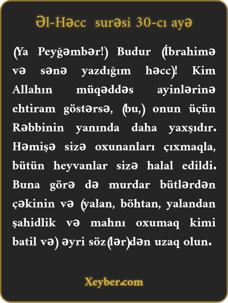 (Ya Peyğəmbər!) Budur (İbrahimə və sənə yazdığım həcc)! Kim Allahın müqəddəs ayinlərinə ehtiram göstərsə, (bu,) onun üçün Rəbbinin yanında daha yaxşıdır. Həmişə sizə oxunanları çıxmaqla, bütün heyvanlar sizə halal edildi. Buna görə də murdar bütlərdən çəkinin və (yalan, böhtan, yalandan şahidlik və mahnı oxumaq kimi batil və) əyri söz(lər)dən uzaq olun.