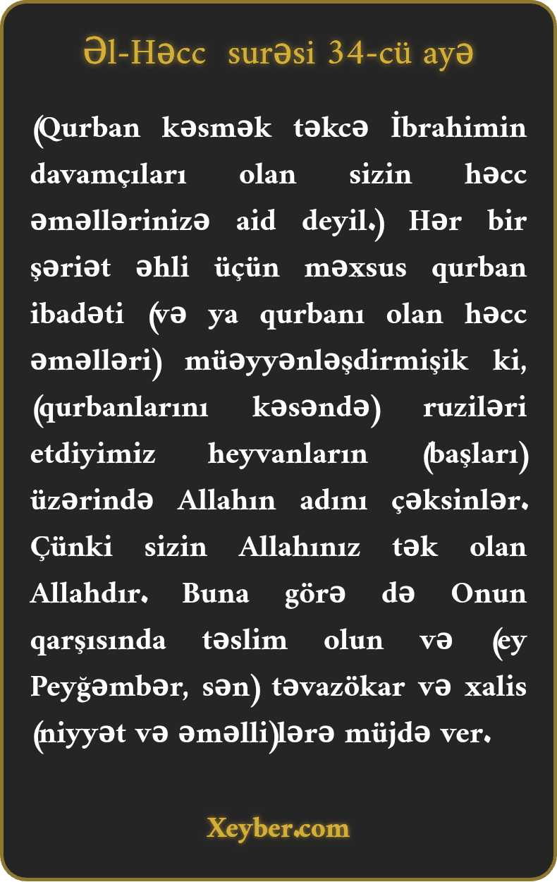 (Qurban kəsmək təkcə İbrahimin davamçıları olan sizin həcc əməllərinizə aid deyil.) Hər bir şəriət əhli üçün məxsus qurban ibadəti (və ya qurbanı olan həcc əməlləri) müəyyənləşdirmişik ki, (qurbanlarını kəsəndə) ruziləri etdiyimiz heyvanların (başları) üzərində Allahın adını çəksinlər. Çünki sizin Allahınız tək olan Allahdır. Buna görə də Onun qarşısında təslim olun və (ey Peyğəmbər, sən) təvazökar və xalis (niyyət və əməlli)lərə müjdə ver.