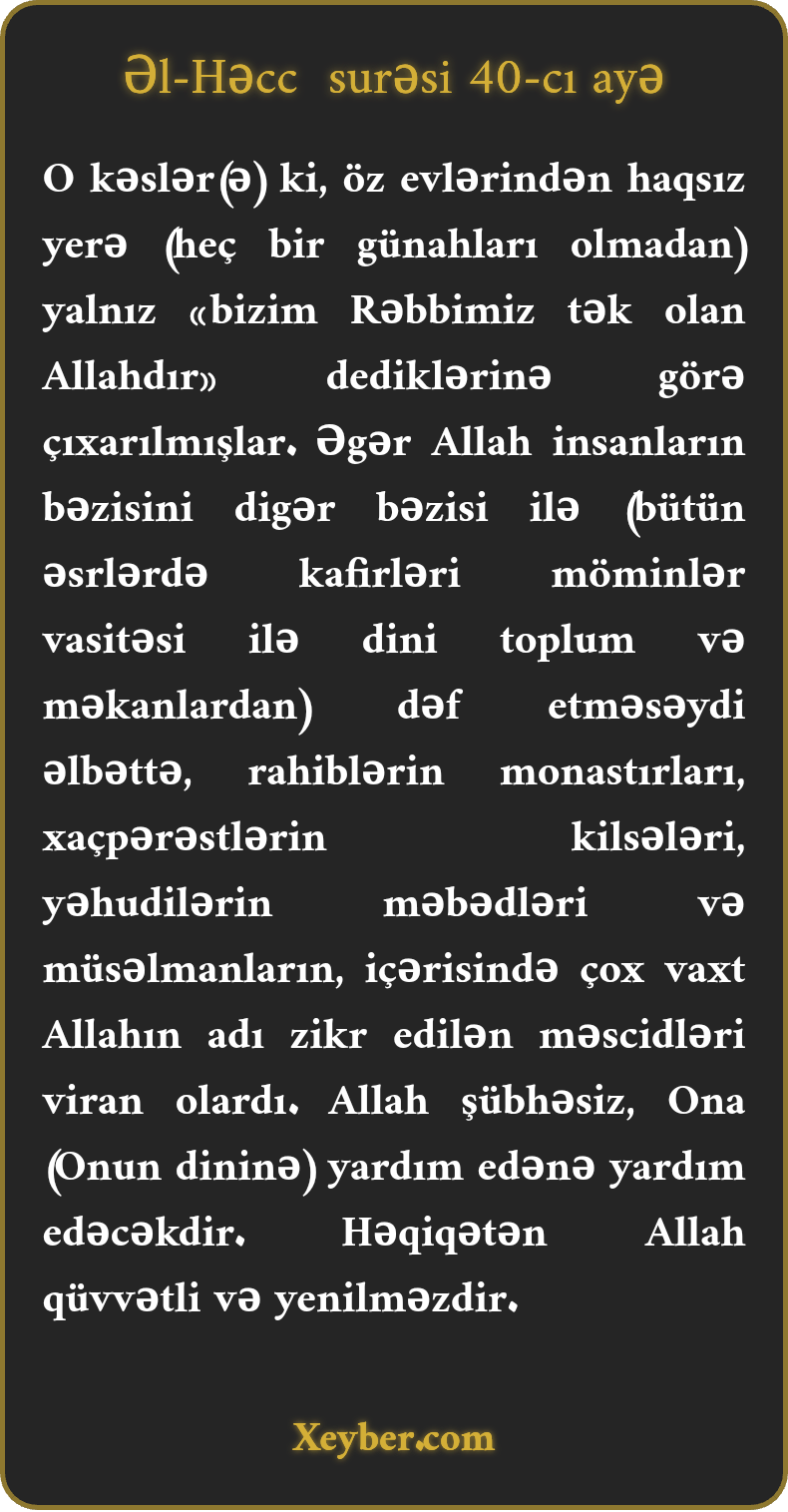 O kəslər(ə) ki, öz evlərindən haqsız yerə (heç bir günahları olmadan) yalnız «bizim Rəbbimiz tək olan Allahdır» dediklərinə görə çıxarılmışlar. Əgər Allah insanların bəzisini digər bəzisi ilə (bütün əsrlərdə kafirləri möminlər vasitəsi ilə dini toplum və məkanlardan) dəf etməsəydi əlbəttə, rahiblərin monastırları, xaçpərəstlərin kilsələri, yəhudilərin məbədləri və müsəlmanların, içərisində çox vaxt Allahın adı zikr edilən məscidləri viran olardı. Allah şübhəsiz, Ona (Onun dininə) yardım edənə yardım edəcəkdir. Həqiqətən Allah qüvvətli və yenilməzdir.