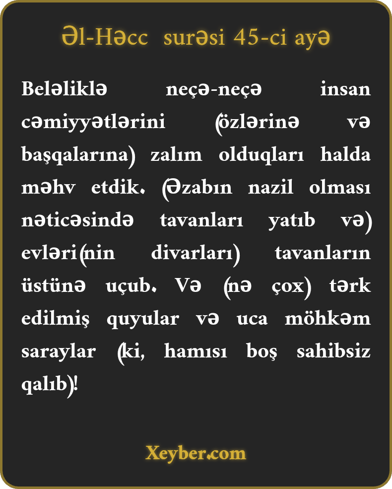 Beləliklə neçə-neçə insan cəmiyyətlərini (özlərinə və başqalarına) zalım olduqları halda məhv etdik. (Əzabın nazil olması nəticəsində tavanları yatıb və) evləri(nin divarları) tavanların üstünə uçub. Və (nə çox) tərk edilmiş quyular və uca möhkəm saraylar (ki, hamısı boş sahibsiz qalıb)!