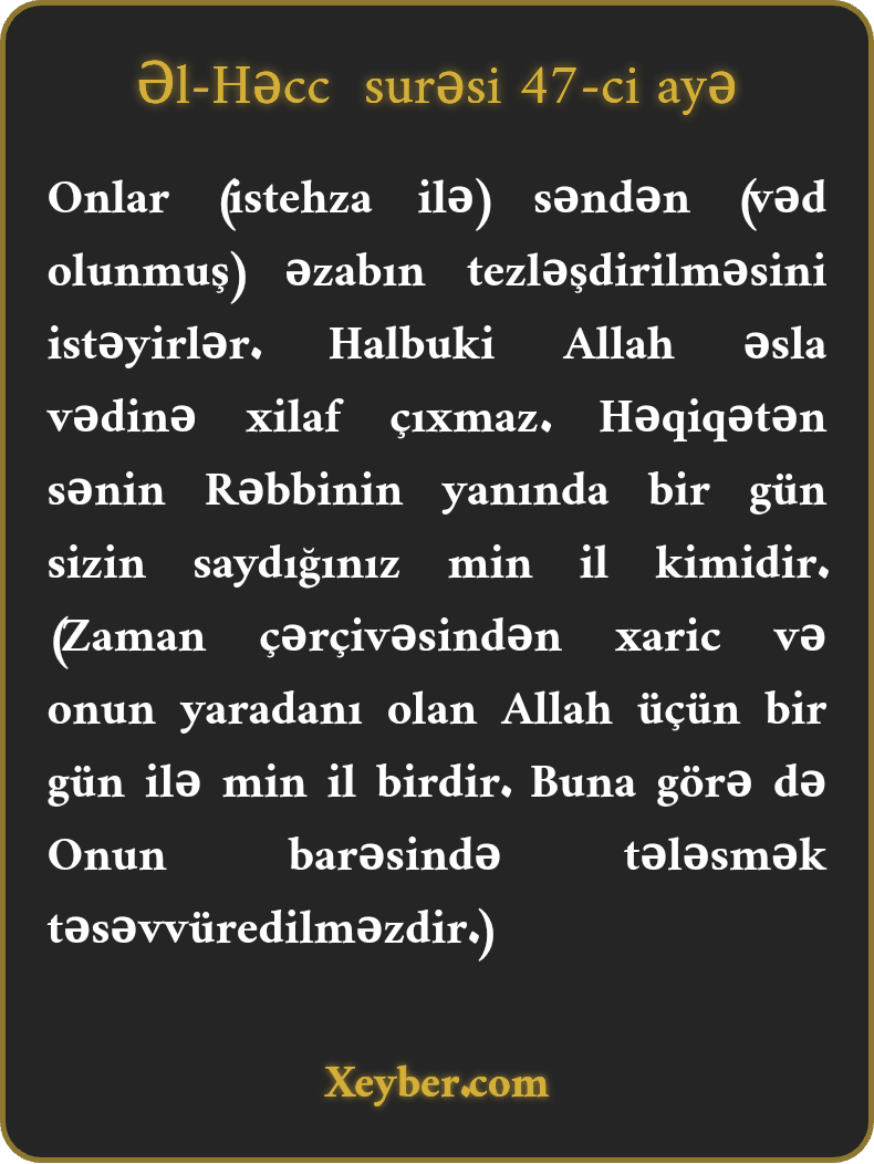 Onlar (istehza ilə) səndən (vəd olunmuş) əzabın tezləşdirilməsini istəyirlər. Halbuki Allah əsla vədinə xilaf çıxmaz. Həqiqətən sənin Rəbbinin yanında bir gün sizin saydığınız min il kimidir. (Zaman çərçivəsindən xaric və onun yaradanı olan Allah üçün bir gün ilə min il birdir. Buna görə də Onun barəsində tələsmək təsəvvüredilməzdir.)