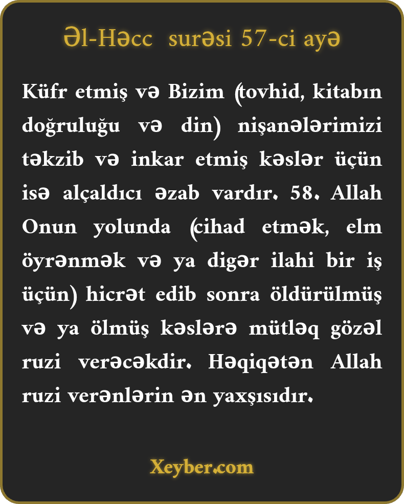 58. Allah Onun yolunda (cihad etmək, elm öyrənmək və ya digər ilahi bir iş üçün) hicrət edib sonra öldürülmüş və ya ölmüş kəslərə mütləq gözəl ruzi verəcəkdir. Həqiqətən Allah ruzi verənlərin ən yaxşısıdır.