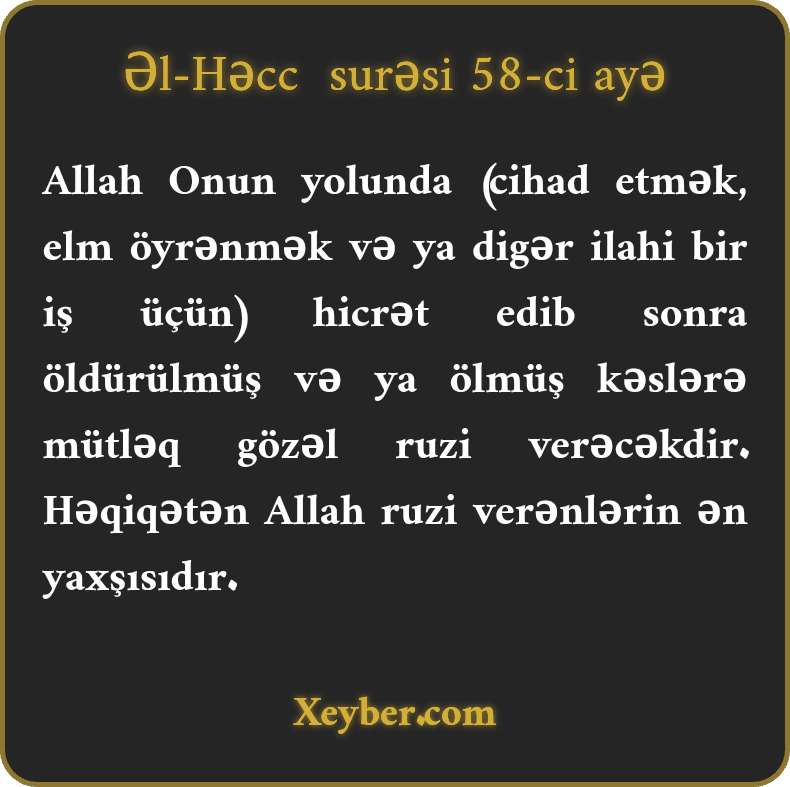 Allah Onun yolunda (cihad etmək, elm öyrənmək və ya digər ilahi bir iş üçün) hicrət edib sonra öldürülmüş və ya ölmüş kəslərə mütləq gözəl ruzi verəcəkdir. Həqiqətən Allah ruzi verənlərin ən yaxşısıdır.