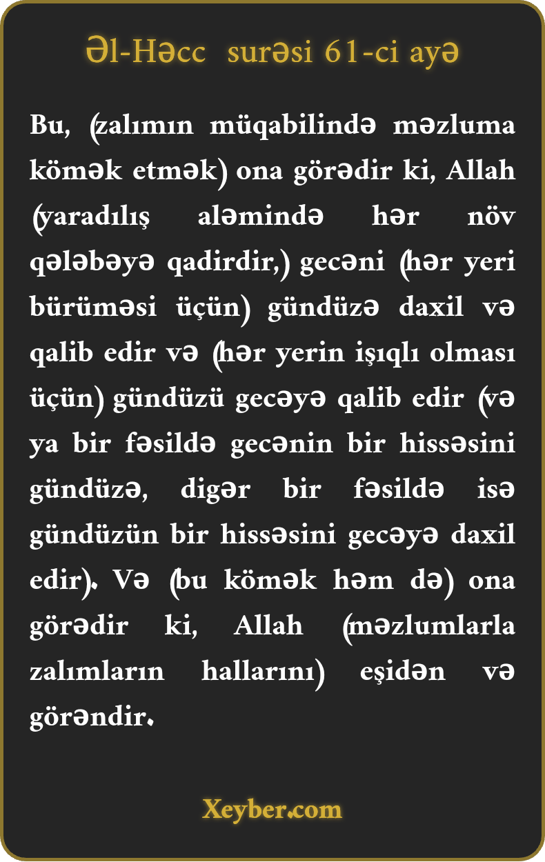 Bu, (zalımın müqabilində məzluma kömək etmək) ona görədir ki, Allah (yaradılış aləmində hər növ qələbəyə qadirdir,) gecəni (hər yeri bürüməsi üçün) gündüzə daxil və qalib edir və (hər yerin işıqlı olması üçün) gündüzü gecəyə qalib edir (və ya bir fəsildə gecənin bir hissəsini gündüzə, digər bir fəsildə isə gündüzün bir hissəsini gecəyə daxil edir). Və (bu kömək həm də) ona görədir ki, Allah (məzlumlarla zalımların hallarını) eşidən və görəndir.