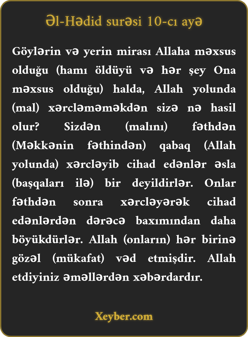 Göylərin və yerin mirası Allaha məxsus olduğu (hamı öldüyü və hər şey Ona məxsus olduğu) halda, Allah yolunda (mal) xərcləməməkdən sizə nə hasil olur? Sizdən (malını) fəthdən (Məkkənin fəthindən) qabaq (Allah yolunda) xərcləyib cihad edənlər əsla (başqaları ilə) bir deyildirlər. Onlar fəthdən sonra xərcləyərək cihad edənlərdən dərəcə baxımından daha böyükdürlər. Allah (onların) hər birinə gözəl (mükafat) vəd etmişdir. Allah etdiyiniz əməllərdən xəbərdardır.