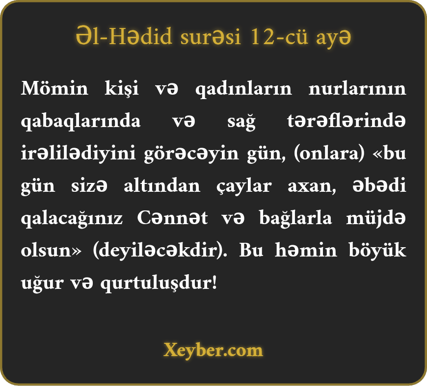 Mömin kişi və qadınların nurlarının qabaqlarında və sağ tərəflərində irəlilədiyini görəcəyin gün, (onlara) «bu gün sizə altından çaylar axan, əbədi qalacağınız Cənnət və bağlarla müjdə olsun» (deyiləcəkdir). Bu həmin böyük uğur və qurtuluşdur!