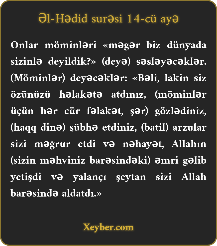 Onlar möminləri «məgər biz dünyada sizinlə deyildik?» (deyə) səsləyəcəklər. (Möminlər) deyəcəklər: «Bəli, lakin siz özünüzü həlakətə atdınız, (möminlər üçün hər cür fəlakət, şər) gözlədiniz, (haqq dinə) şübhə etdiniz, (batil) arzular sizi məğrur etdi və nəhayət, Allahın (sizin məhviniz barəsindəki) əmri gəlib yetişdi və yalançı şeytan sizi Allah barəsində aldatdı.»