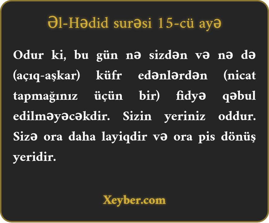 Odur ki, bu gün nə sizdən və nə də (açıq-aşkar) küfr edənlərdən (nicat tapmağınız üçün bir) fidyə qəbul edilməyəcəkdir. Sizin yeriniz oddur. Sizə ora daha layiqdir və ora pis dönüş yeridir.