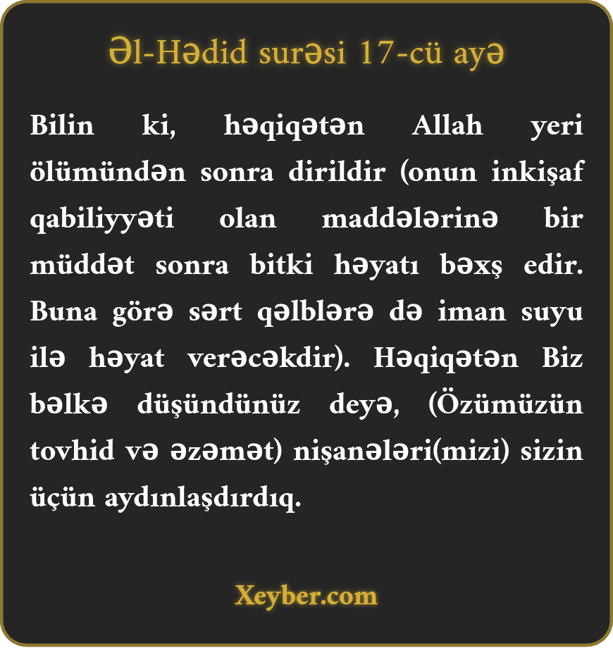 Bilin ki, həqiqətən Allah yeri ölümündən sonra dirildir (onun inkişaf qabiliyyəti olan maddələrinə bir müddət sonra bitki həyatı bəxş edir. Buna görə sərt qəlblərə də iman suyu ilə həyat verəcəkdir). Həqiqətən Biz bəlkə düşündünüz deyə, (Özümüzün tovhid və əzəmət) nişanələri(mizi) sizin üçün aydınlaşdırdıq.