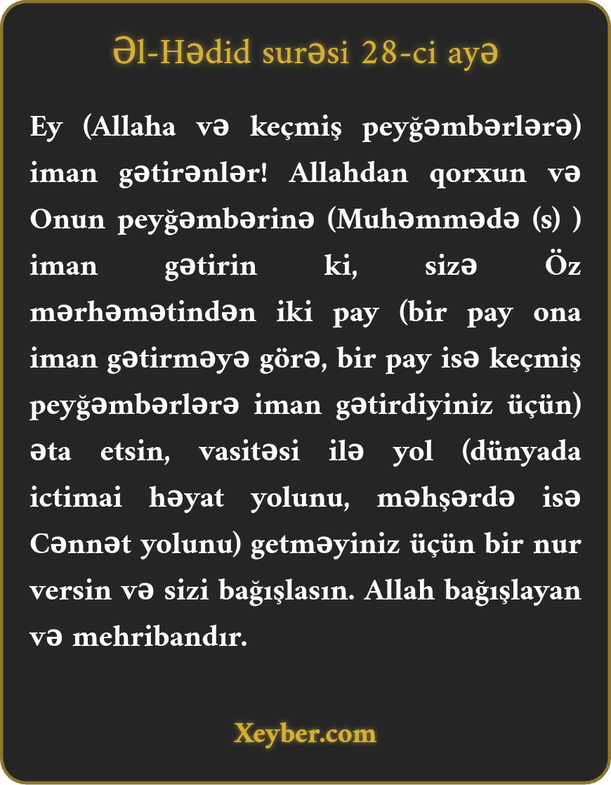 Ey (Allaha və keçmiş peyğəmbərlərə) iman gətirənlər! Allahdan qorxun və Onun peyğəmbərinə (s">(Muhəmmədə (s) ) iman gətirin ki, sizə Öz mərhəmətindən iki pay (bir pay ona iman gətirməyə görə, bir pay isə keçmiş peyğəmbərlərə iman gətirdiyiniz üçün) əta etsin, vasitəsi ilə yol (dünyada ictimai həyat yolunu, məhşərdə isə Cənnət yolunu) getməyiniz üçün bir nur versin və sizi bağışlasın. Allah bağışlayan və mehribandır.