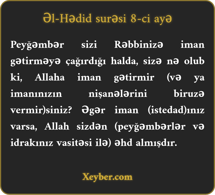 Peyğəmbər sizi Rəbbinizə iman gətirməyə çağırdığı halda, sizə nə olub ki, Allaha iman gətirmir (və ya imanınızın nişanələrini biruzə vermir)siniz? Əgər iman (istedad)ınız varsa, Allah sizdən (peyğəmbərlər və idrakınız vasitəsi ilə) əhd almışdır.