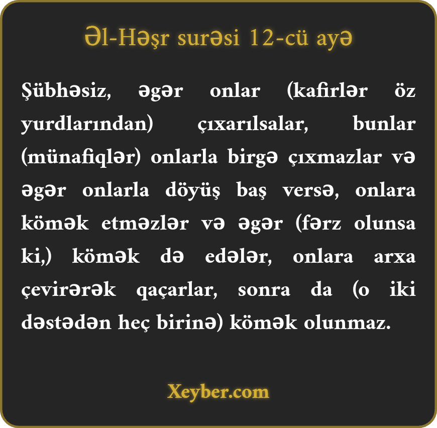 Şübhəsiz, əgər onlar (kafirlər öz yurdlarından) çıxarılsalar, bunlar (münafiqlər) onlarla birgə çıxmazlar və əgər onlarla döyüş baş versə, onlara kömək etməzlər və əgər (fərz olunsa ki,) kömək də edələr, onlara arxa çevirərək qaçarlar, sonra da (o iki dəstədən heç birinə) kömək olunmaz.