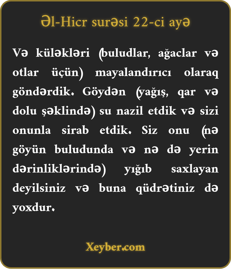 "Küləkləri (buludları və bitkiləri) bara gətirmək üçün göndərdik. Səmadan su nazil etdik. Beləcə, yağışın xəzinədarı olmadığınız və onu ehtiyat üçün saxlaya bilmədiyiniz halda sizi onunla sirab etdik.”