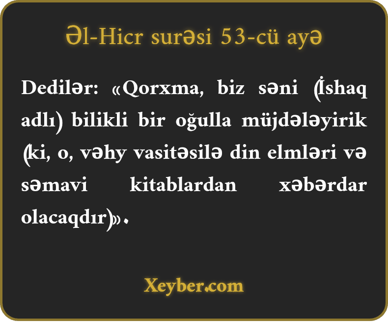 Dedilər: «Qorxma, biz səni (İshaq adlı) bilikli bir oğulla müjdələyirik (ki, o, vəhy vasitəsilə din elmləri və səmavi kitablardan xəbərdar olacaqdır)».