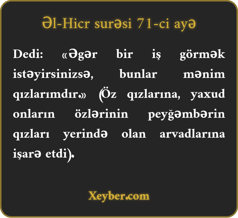 "(Lut) dedi: "Əgər sizin bir məqsədiniz varsa, onlar mənim qızlarımdır. (Onlarla evlənin və həmcinsbazlıqdan çəkinin.)”