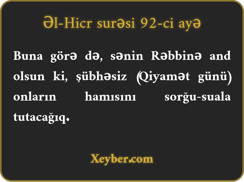 "And olsun Rəbbinə, (qiyamət günü) Biz onların hər birini sorğuya çəkəcəyik.”