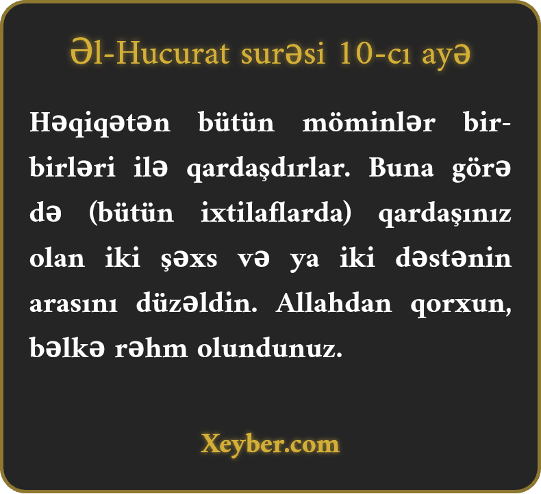 Həqiqətən bütün möminlər bir-birləri ilə qardaşdırlar. Buna görə də (bütün ixtilaflarda) qardaşınız olan iki şəxs və ya iki dəstənin arasını düzəldin. Allahdan qorxun, bəlkə rəhm olundunuz.