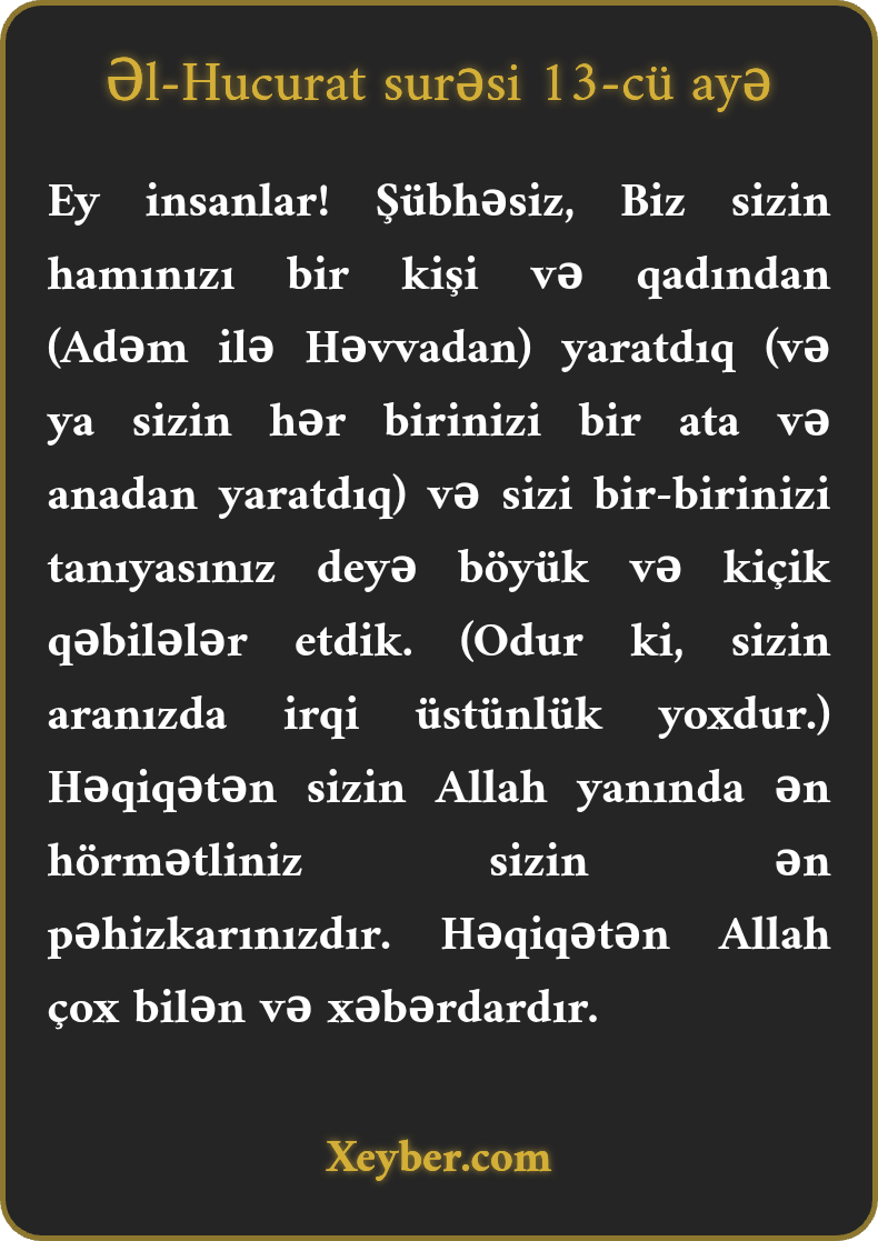 Ey insanlar! Şübhəsiz, Biz sizin hamınızı bir kişi və qadından (Adəm ilə Həvvadan) yaratdıq (və ya sizin hər birinizi bir ata və anadan yaratdıq) və sizi bir-birinizi tanıyasınız deyə böyük və kiçik qəbilələr etdik. (Odur ki, sizin aranızda irqi üstünlük yoxdur.) Həqiqətən sizin Allah yanında ən hörmətliniz sizin ən pəhizkarınızdır. Həqiqətən Allah çox bilən və xəbərdardır.
