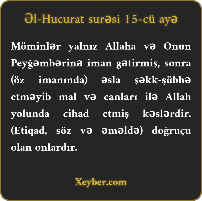 Möminlər yalnız Allaha və Onun Peyğəmbərinə iman gətirmiş, sonra (öz imanında) əsla şəkk-şübhə etməyib mal və canları ilə Allah yolunda cihad etmiş kəslərdir. (Etiqad, söz və əməldə) doğruçu olan onlardır.