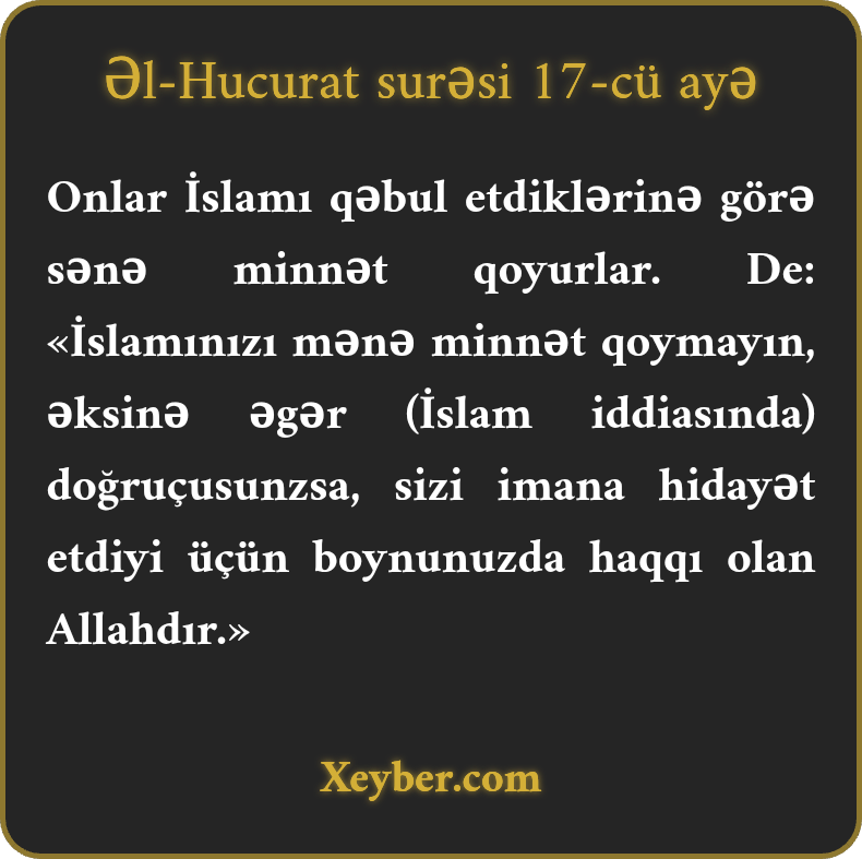 Onlar İslamı qəbul etdiklərinə görə sənə minnət qoyurlar. De: «İslamınızı mənə minnət qoymayın, əksinə əgər (İslam iddiasında) doğruçusunzsa, sizi imana hidayət etdiyi üçün boynunuzda haqqı olan Allahdır.»