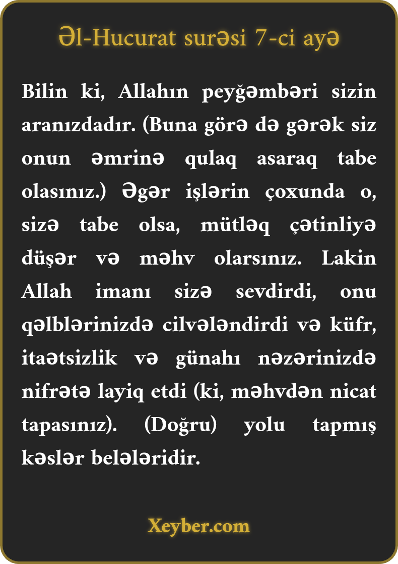 Bilin ki, Allahın peyğəmbəri sizin aranızdadır. (Buna görə də gərək siz onun əmrinə qulaq asaraq tabe olasınız.) Əgər işlərin çoxunda o, sizə tabe olsa, mütləq çətinliyə düşər və məhv olarsınız. Lakin Allah imanı sizə sevdirdi, onu qəlblərinizdə cilvələndirdi və küfr, itaətsizlik və günahı nəzərinizdə nifrətə layiq etdi (ki, məhvdən nicat tapasınız). (Doğru) yolu tapmış kəslər belələridir.
