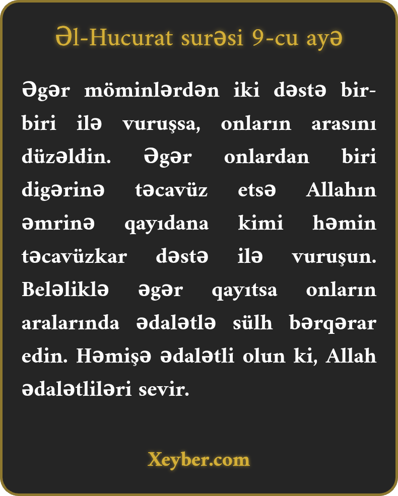 Əgər möminlərdən iki dəstə bir-biri ilə vuruşsa, onların arasını düzəldin. Əgər onlardan biri digərinə təcavüz etsə Allahın əmrinə qayıdana kimi həmin təcavüzkar dəstə ilə vuruşun. Beləliklə əgər qayıtsa onların aralarında ədalətlə sülh bərqərar edin. Həmişə ədalətli olun ki, Allah ədalətliləri sevir.