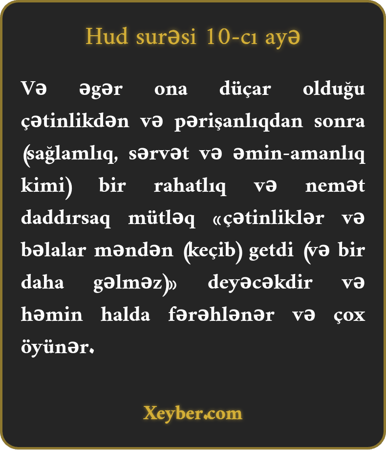 "İnsana çətinlik və möhnətdən sonra bir nemət daddırsaq, (qürrələnib) deyər: "Həqiqətən, çətinliklər məndən kənarlaşdı. Şübhəsiz, o, sevinib öyünəndir.”